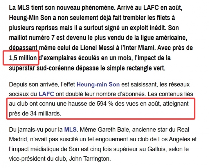 在球场上,孙兴慜6场5球2助,球场外孙兴慜也正在打破纪录。梅西在迈阿密此前单月内售出50万件球衣,而自孙兴慜8月加盟后他的球衣已经售出150万件(RMC文中并未说明数据来源)。