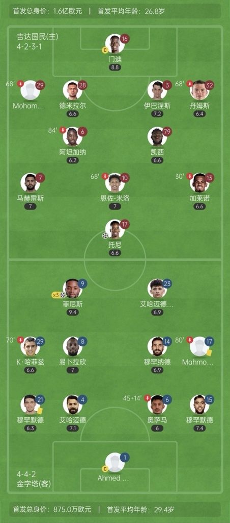本场比赛,吉达国民队内门迪、马赫雷斯、伊万-托尼等十名外援全部先发,只有右后卫穆罕默德-阿卜杜拉赫曼是沙特本土球员。吉达国民首发身价是对手18倍多。