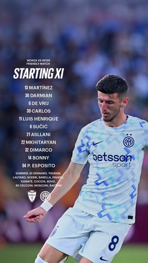 国米首发:13-何塞普-马丁内斯、36-达米安、6-德弗里、30-奥古斯托、8-苏西奇、1-阿斯拉尼、22-姆希塔良、32-迪马尔科、11-恩里克、14-博尼、94-F-埃斯波托尼